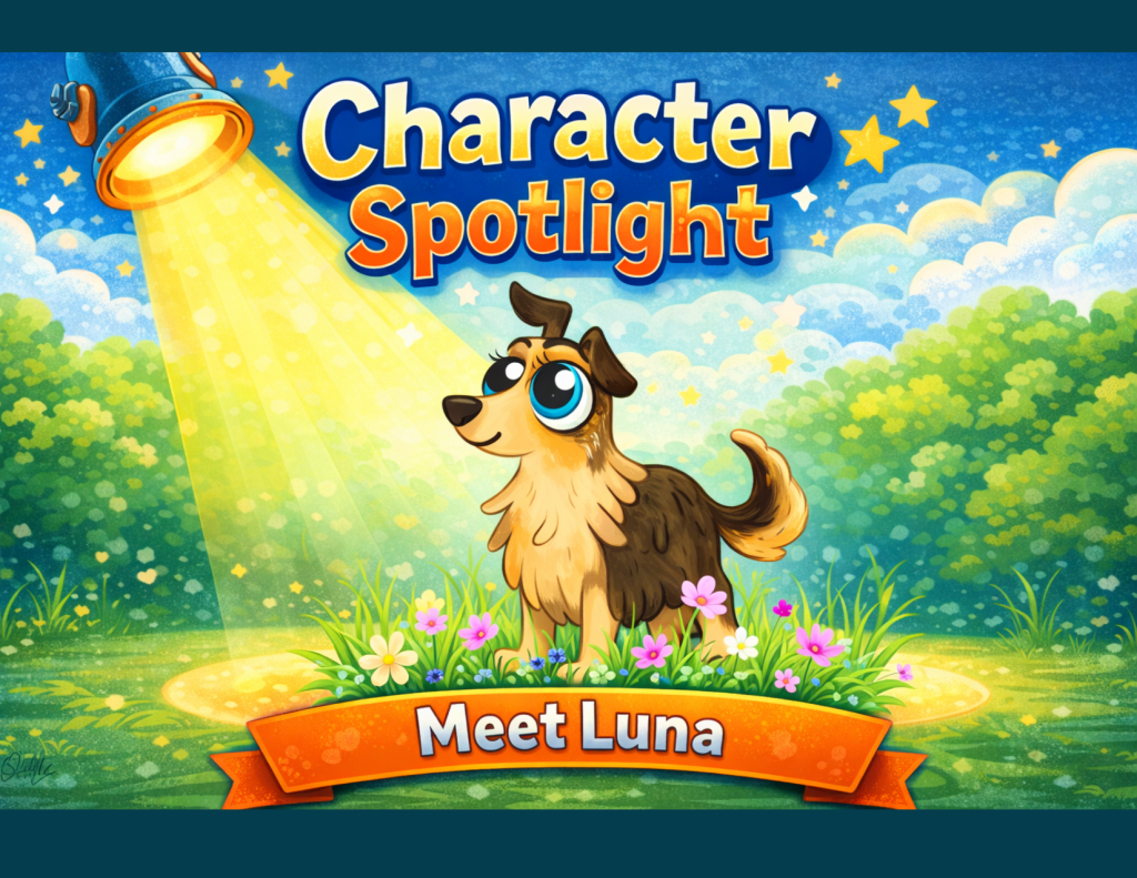 In Scout's Delicious Day, she watches over Scout's adventures from a distance, making sure he finds his way home safely. In Scout's Rainy Day, she does something even more powerful: she sits beside Scout when he is experiencing big emotions. In Scout’s Muddy day, Luna follows Scout on his adventure on the farm and make sure his friends recognize him.